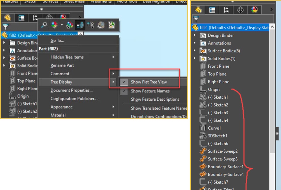 After activating Show Flat Tree View, is it possible to unhide all sketches and features in one go?