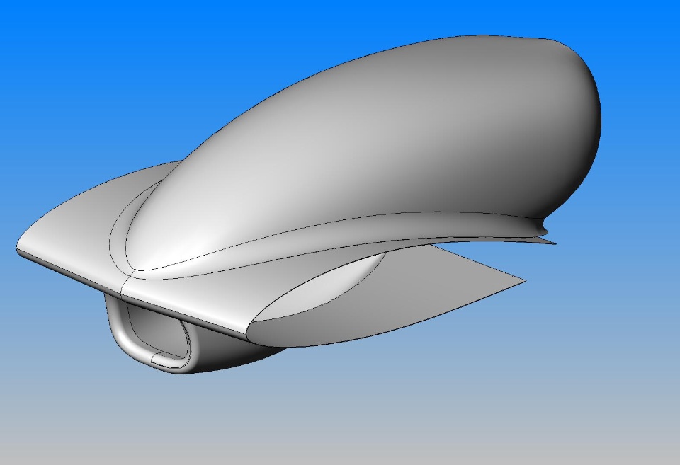 I am working on the design of a cowling for an amphibiousairplane. I have found that boundary surfaces are the most stableand controllable form of loft. This part is composed of a sweep,and two very simple surface lofts, which are knit into solidscombined, fillets added, shelled and finally mirrored.