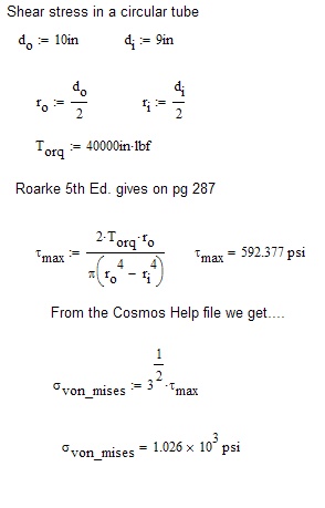 I have a tube loaded in a static torsion condition. The tube is 1"O.D. by .67" I.D. by 36" long. The tube is fixed at one end and theload applied to the other. First I calculated the Shear Stress byhand based on T = S X Z (where T is the torque applied and Z is thePolar Section modulus). That works out to about 48,000 psi. Cosmossays 86,000 psi (about 1.75 times). I turned on large displacement,but didn't see any change in results. Clearly I have made a mistakesomewhere, but this seems so simple I can't figure out where. Iappreciate any input you guys have.