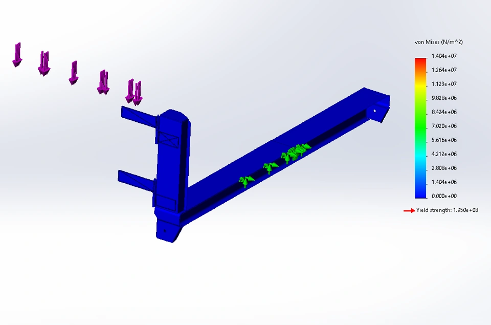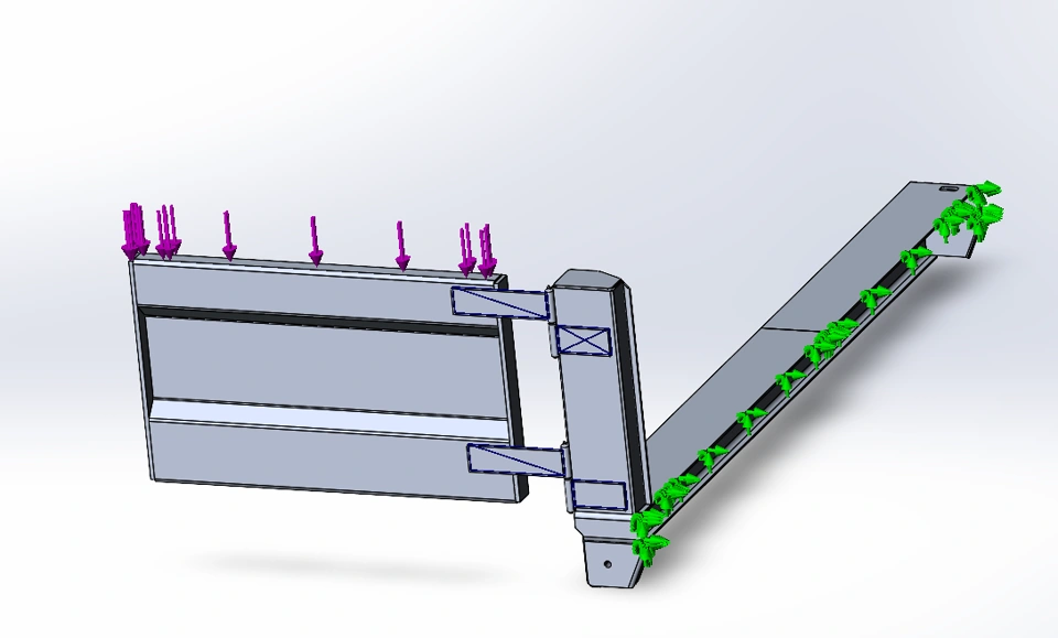 I am trying to do a simulation on a barn door that is placed on a dump body. The door is supposed to hold an extra (350lbs) and hang off to the sides when it's fully open (See picture). When I run the study the door itself disappears in both stress and displacement study results.