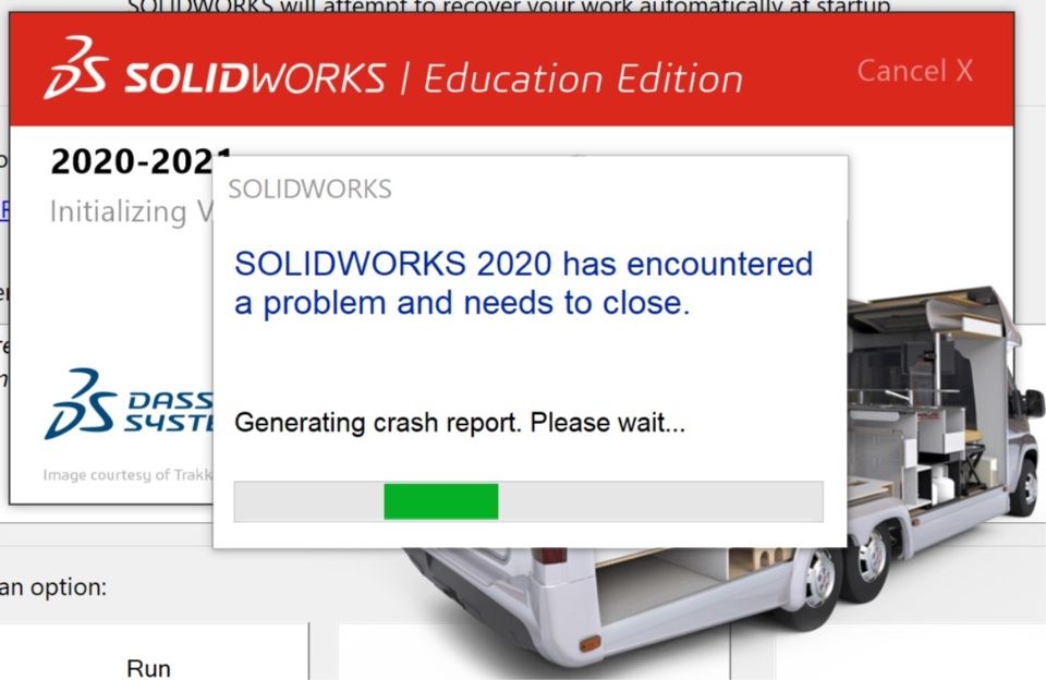 Every time I start Solidworks the message "Solidworks 2020 has encountered a problem and needs to close. " appears.