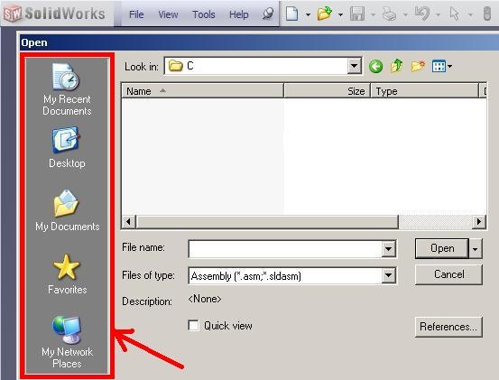 Is there any way to add specific directories to the side bar of the Open dialogue box within SolidWorks? (image attached)