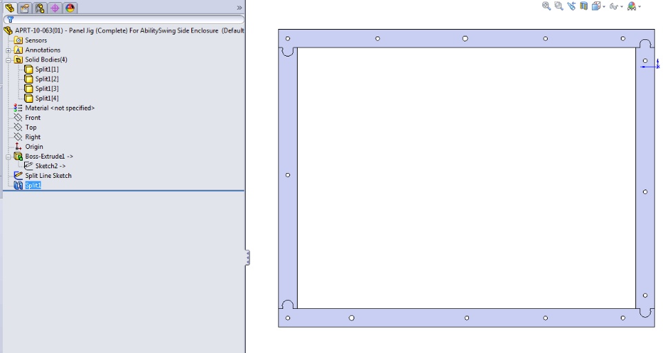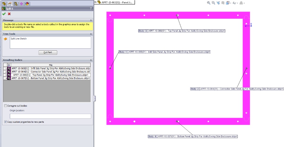 Been using the Split Feature to turn a single part (basically a frame) into 4 separate parts (left vertical right vertical, top & bottom)