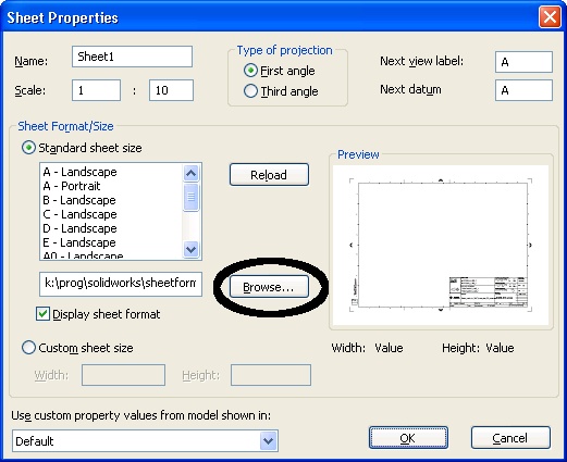 Currently I have to update our company's drawing templates, these exists of 5 sizes. At the start the engineer chooses his drawing sheet size. This choice is not always the right one and needs to be changed during the project. They can do this via the sheets properties, and then choose browse and select the correct file. (All the sheet sizes are saved as .slddrt) we have several customers who all have there own title blocks for several sheet sizes) A lot of things can go wrong.