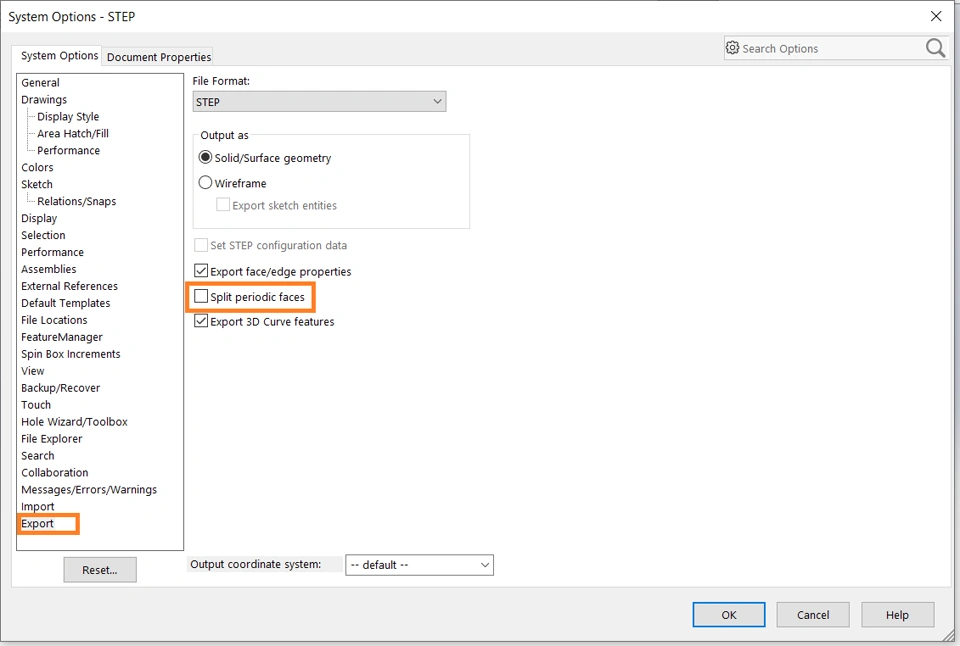 I also tried checking/unchecking the "Split periodic faces" and "Export face/edge properties" options: