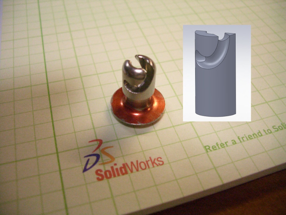 I need to reverse a feature found in a 1/4 turn fastener. I only need the sweep cut, but can't seem to get it to cut through like the actual part does. I would like to be able to cut through the solid model just like a machinist would cut through with an end mill. Meaning, always perpendicualr to the curved surface.