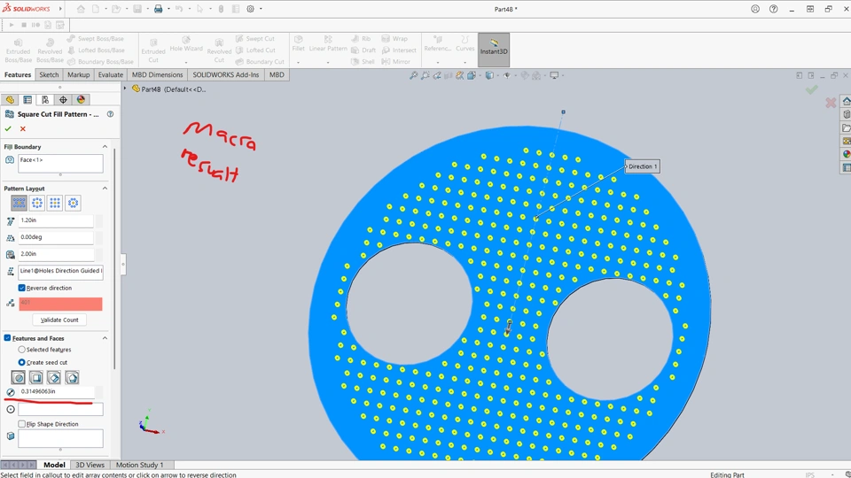 I'm working on a SolidWorks macro in C#, and one of the tasks involves creating an extrude cut on a base using the fill pattern feature. However, I’ve encountered a strange issue. When I attempt to define a circular seed cut with a specific diameter, the macro always defaults to the SolidWorks default diameter (0.31 inches), regardless of the value I assign.