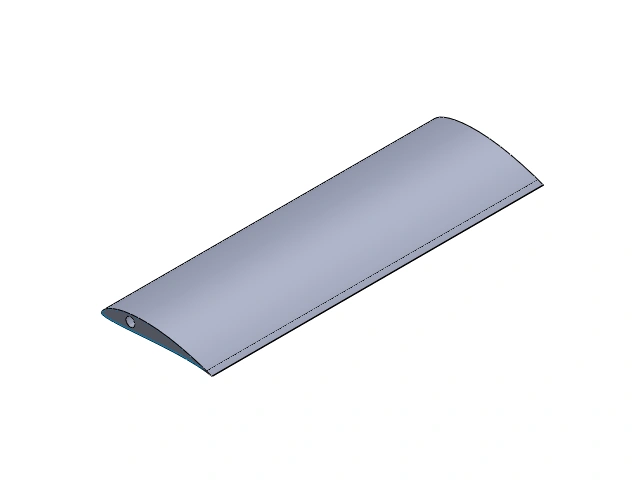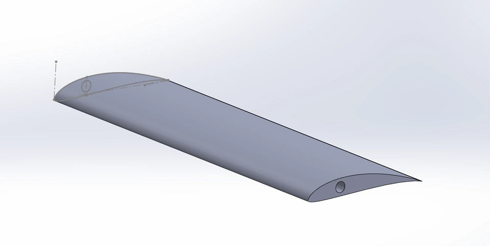 The trailing edge of this airfoil was open (typical of airfoil coordinates) so I closed it using tangent lines at the trailing edge making a closed contour. The whole in the middle is for spar. Then I extruded it to give the following geometry.