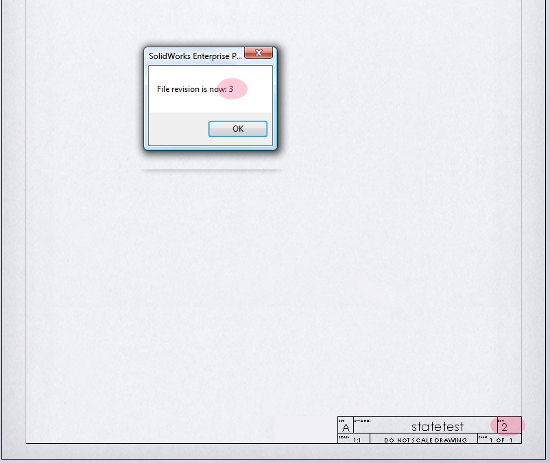 As you can see, the dialog box shown by my add-in code correctly shows the file revision as 3, whereas the open document in SolidWorks is still showing revision 2. Only after I dismiss the dialog box and my add-in exits the OnCmd method does the SW document update the revision to 3.