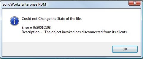 It seems that the add-in is holding a pointer the open document. I close and re-open that document, but the EPDM SolidWorks add-in doesn't notice and it tries to use the now invalid pointer once I've exited my OnCmd method. The error message is only an annoyance, since all the files end up where they should be with the correct revisions, but since the error happens every time, it gets tedious very quickly.