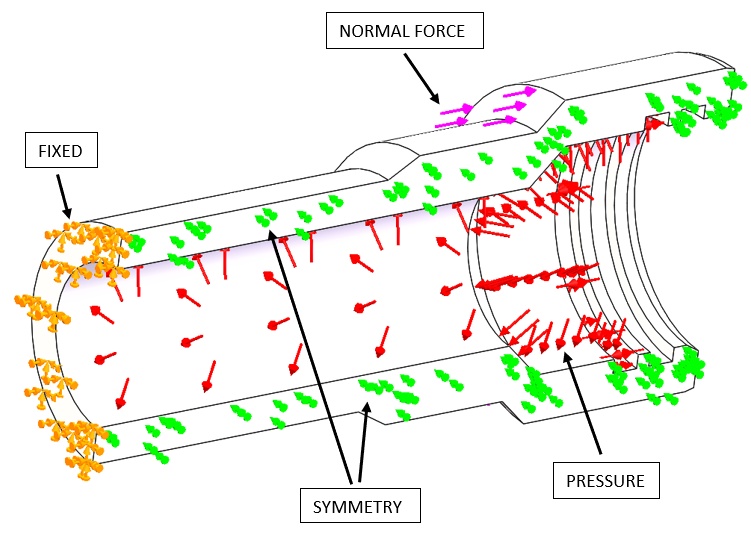 Has anybody had similar problems when using the cyclic symmetry fixture. I have the same problem even when using the symmetry, roller, and normal force fixture. I'm not sure if its a problem with my setup, I have a fixed end at the end of the pipe, an internal pressure, and a normal force on a load shoulder on the OD of the part.