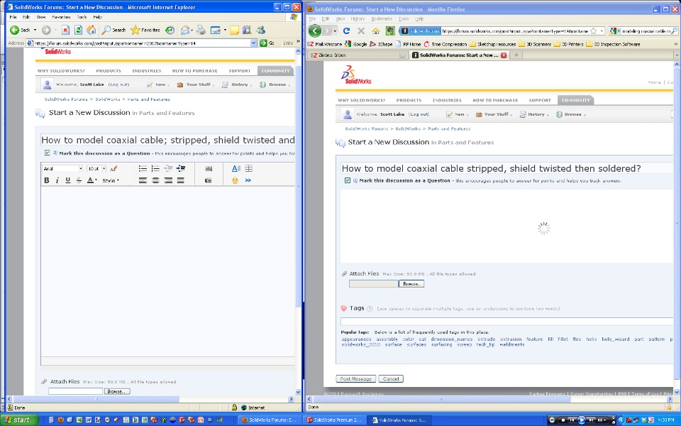 I'm unable to even post a discussion topic in the forums when using Firefox. Attached is a .png showing a side-by-side comparison of IE vs. Firefox when trying to make a post to the SW forums.
