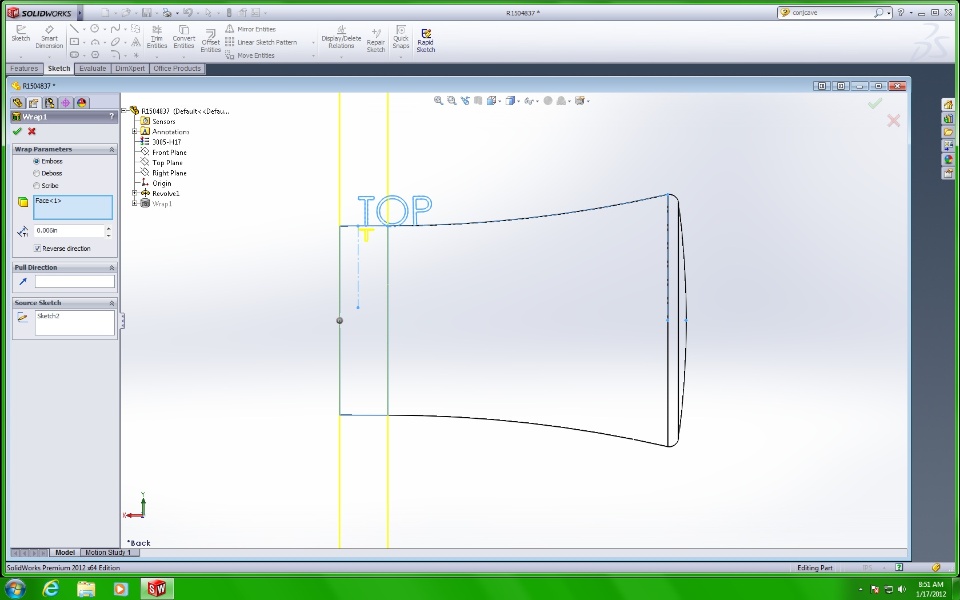 I am trying to have text wrap around the outide of my model. The model has a flat cylindrical surface that transitions into a concave surface. When I wrap the text, the text only wraps on the cylindrical surface and not the concave surface. Anyone know to wrap on multiple surfaces? Do I have to create a plane that follows the concave surface? I've tried but I've been unsuccesful. Here is a picture of my part and I've attached the file below. Any help would be appreciated.