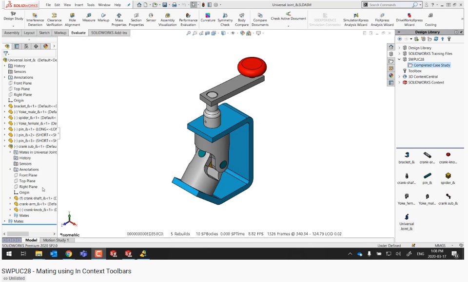 4. Create the assembly shown in the video. A 2017 version of the completed assembly (using Width mates for the Spider) is attached.