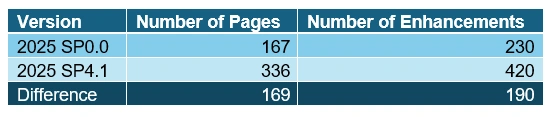 For example, in 2025 the document grew from 167 pages at SP0 to 330 pages by SP4.1, as 190 enhancements landed mid-cycle.