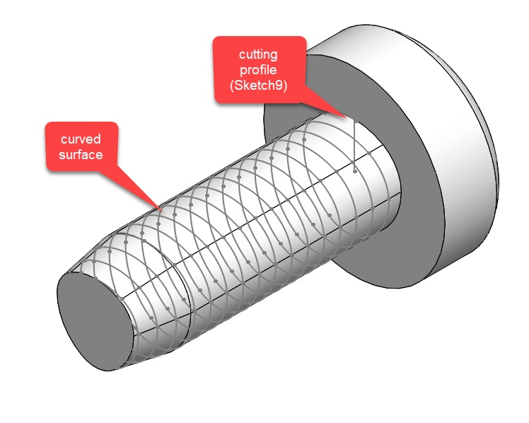 This is a uneven curved surface. Intersection curve tool is used to project Helix and Spiral curve on the surface. Sketch9 is a cutting profile to cut along the projected Helix and Spiral curve on the surface. But it is not cutting. How to fix it?