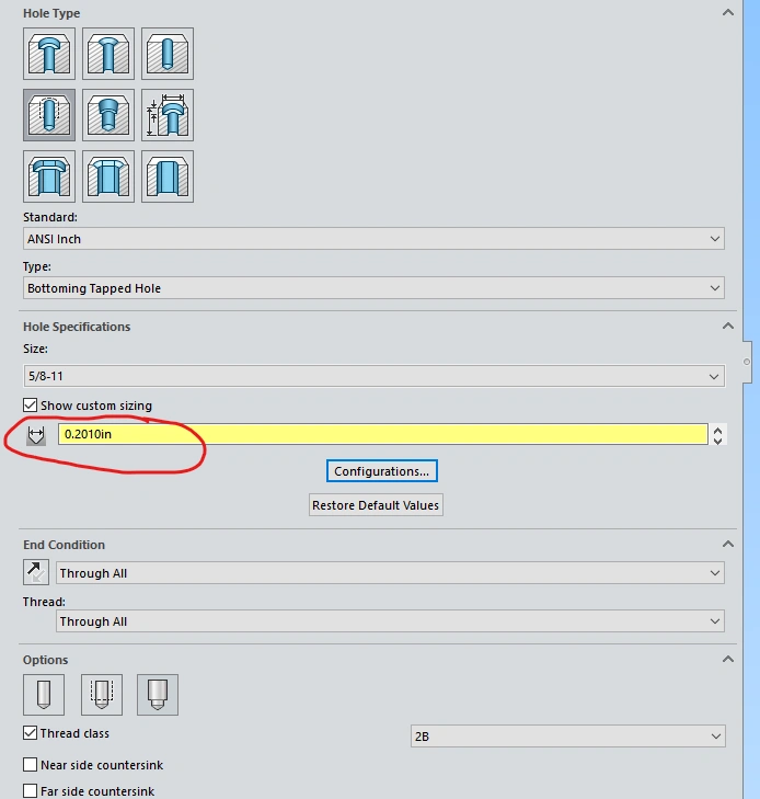 All I want to do is get it back to using the default sizes but if I select for all configs it makes all the holes the same size as well as the pilot hole. So, I then went through and changed each hole size in the design table and that set them to the correct OD, but all the pilot hole sizes are the same size.