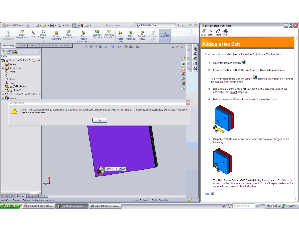 Recently we encountered a problem and have not been able to fix it. Every time we try to insert bolts or fasteners from the Solidworks tool box into our assemblies we get an error. I took a screen shot of the error and have attached it below.