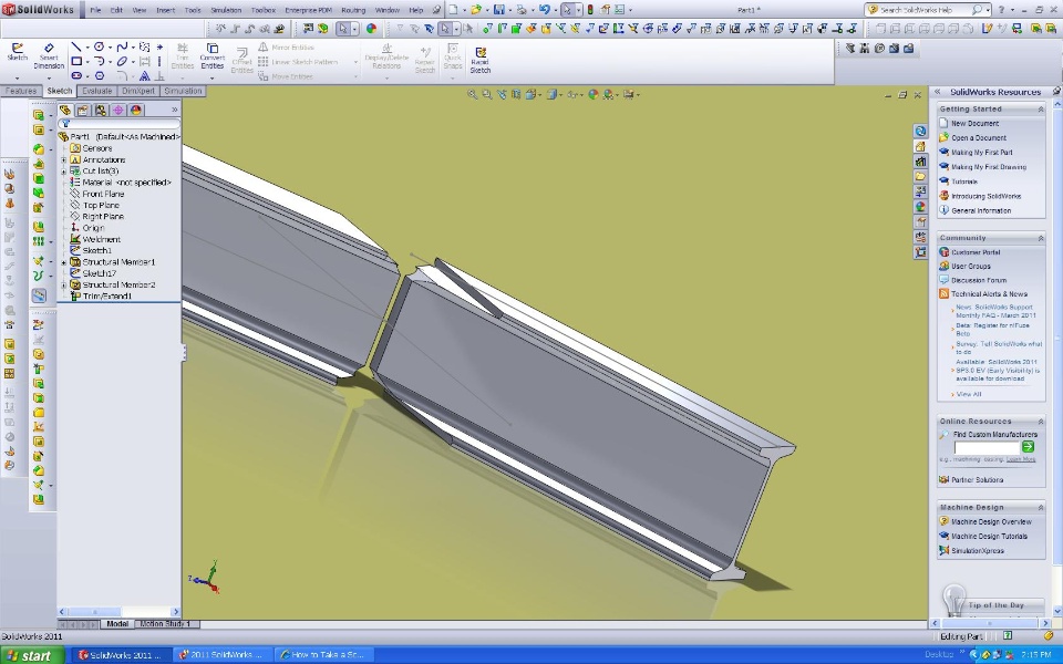 two i-beam joint in an angle, and do the trim. after the trim the end of the beam shows funny, i mean there is nothing wrong with SW, but it's not the real notching in the shop,