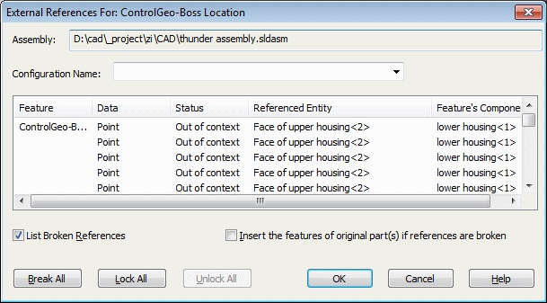 I'm assuming the reference is to "M-021". If I open that file, I see the same Grayed Out reference, but none of the external references in the File Manager point to the assembly. Well, sort of. I can show a RMB > List External References on the feature "Boss Location" and see the reference is to a part in the assembly "upper housing" that is now out of context. That part has also been renamed.
