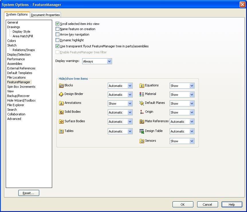 The option is grayed out in TOOLS--->OPTIONS--->FEATUREMANAGER and therefore the filter is not showing in feature tree. How do i get the filter back??