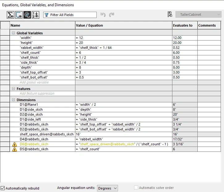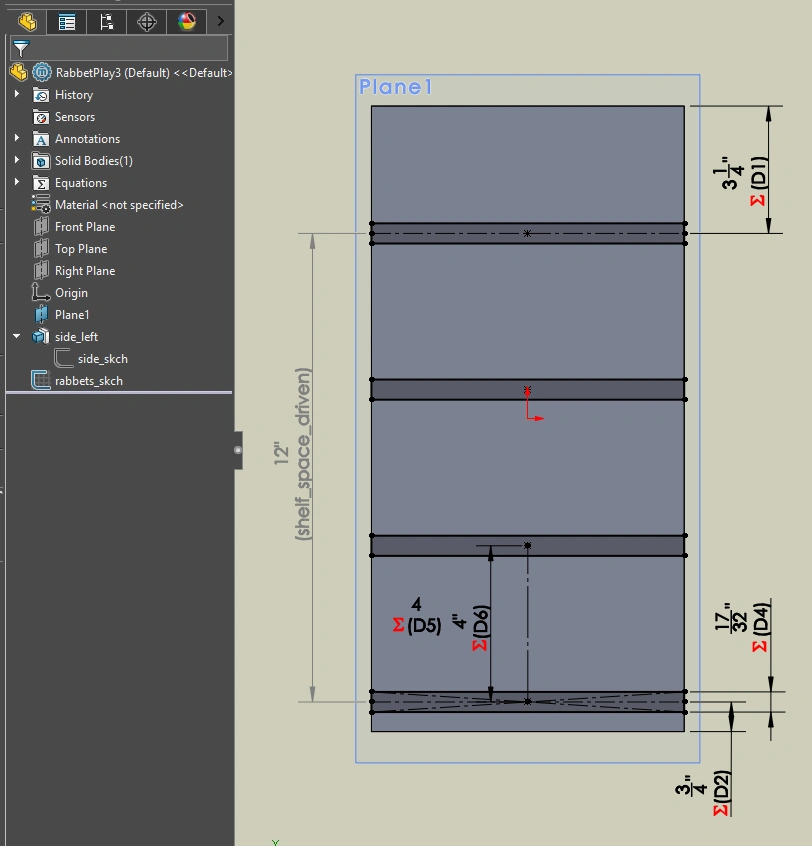 As an example, shelves are mounted into a side board using rabbet joints. The number of shelves and the height of the side are configuration dependent. This seems to be done straightforwardly with a linear pattern leveraging a driven dimension to control the shelf spacing.