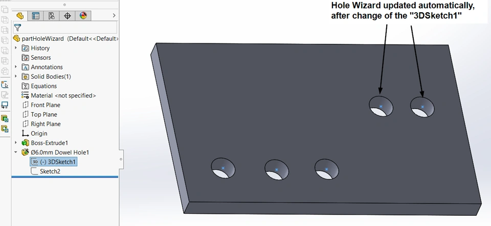 When I close edit sketch, Hole Wizard is updated automatically, and adds two new holes, at the location of the upper two new points: