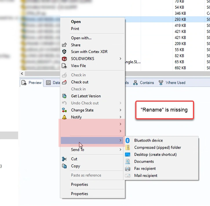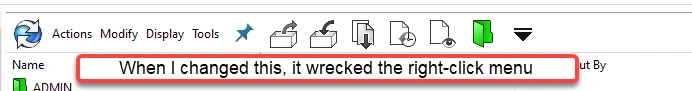 - For one group, I added the "Change State" icon to the Quick Actions toolbar in PDM. When I did this, it trashed the right-click menu (image below), some icons and text disappeared. When I reset t tohe quick access toolbar, things returned to normal behavior. Wow.