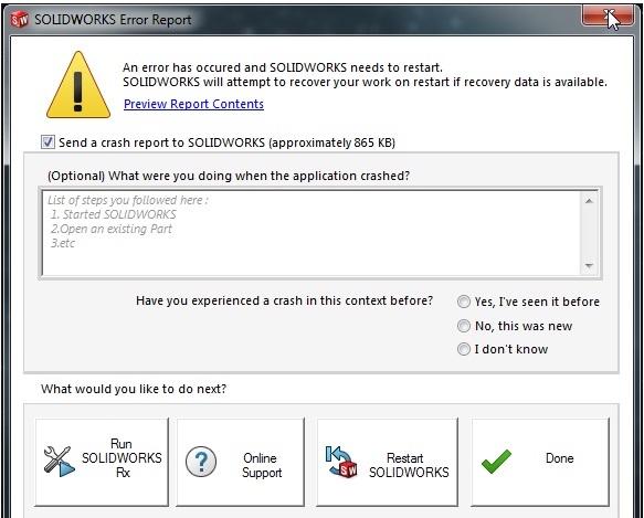 I have one problem regarding file opening whenever I try to open the file i get error as "solidworks error report" I have attached the snap . if you know the solution, please help your help will be appreciated.