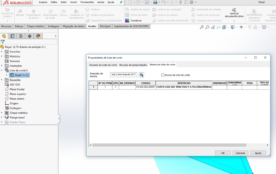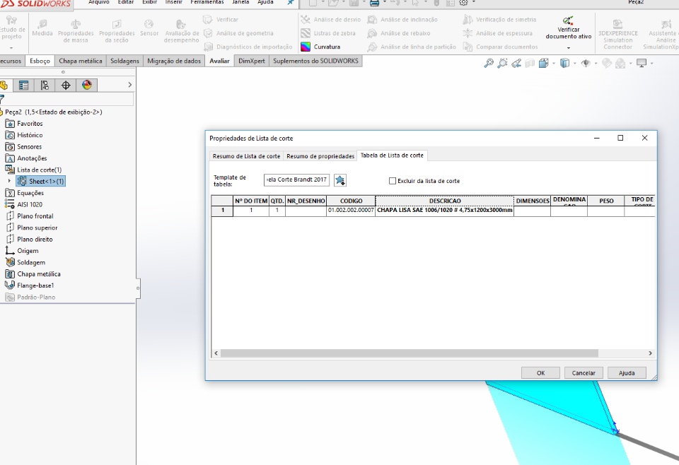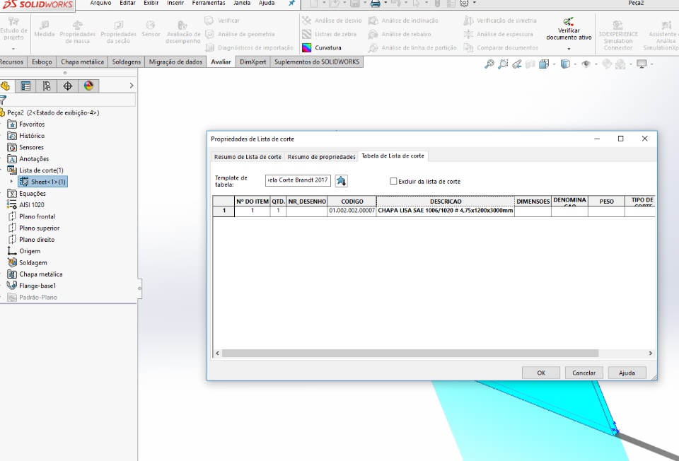 ao cadastrar um material em um corpo da lista de corte (sheet 1 ,Sheet 2 ...)