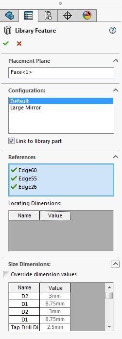As you can see, the dimensions shown in the first image in this post aren't available for editing as "Locating Dimensions". They do show up in the "Size Dimensions" section (see image above on the right), but I would rather preserve the link to the library feature. Since the dimensions are internal to the sketch that defines the hole feature in the library feature, I thought that maybe the problem was that I needed to have the hole feature located based on an external sketch that also got included as part of the library feature. However, when I attempted to recreate the library feature with the an external sketch locating the hole feature included, I couldn't get it to include the sketch as part of the feature, and as a result, the dimensions were not included in the feature.