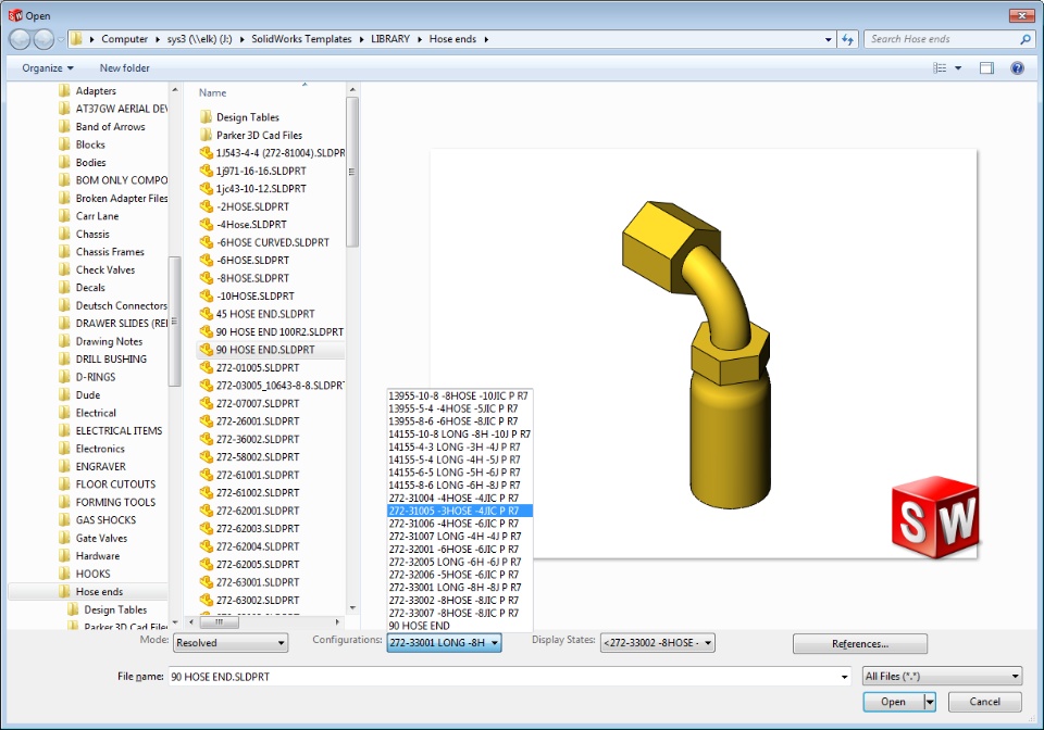 I'm wanting to change a component within my assembly. The current component (a 45 deg elbow hydraulic fitting) has a handful of configurations for the different sizes offered, -4 JIC, -6 JIC, -8JIC, etc. I'm trying to figure out the best way to plumb a new setup, so I want to see if a 90 deg fitting is the better choice (several configs to this part as well). I RMC on the 45 deg fitting and select "Replace Component", navigate to the 90 deg fitting part and click on the file. The window pops up which lets me select the "Configuration, Display State, etc". When I select the "Configuration" I would like to show when the replacement is complete, SW never presents that configuration. It appears that the config presented is the "Last Saved" config of the replacement part.