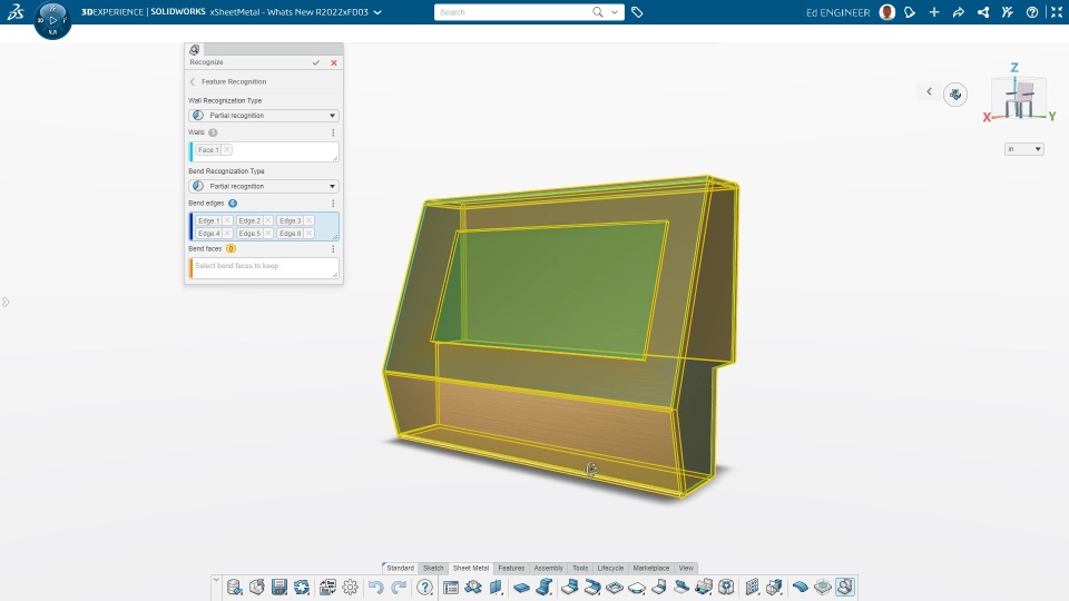 Enhanced Recognize Feature The Recognize feature is enhanced to recognize solid bodies and surface bodies, and convert them to sheet metal bodies. It can now recognize more body types than previously possible.