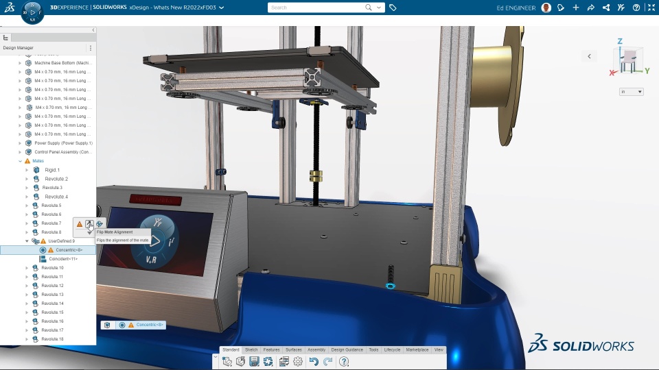 Flip Mated Components from the Tree You can flip the alignment of the mated components using the context menu in the tree. When you click a mate in the tree, use the Flip command in a context menu to flip the mate alignment. The command is available for mate types that have two possible alignments, such as coincident, distance, parallel, and tangent.