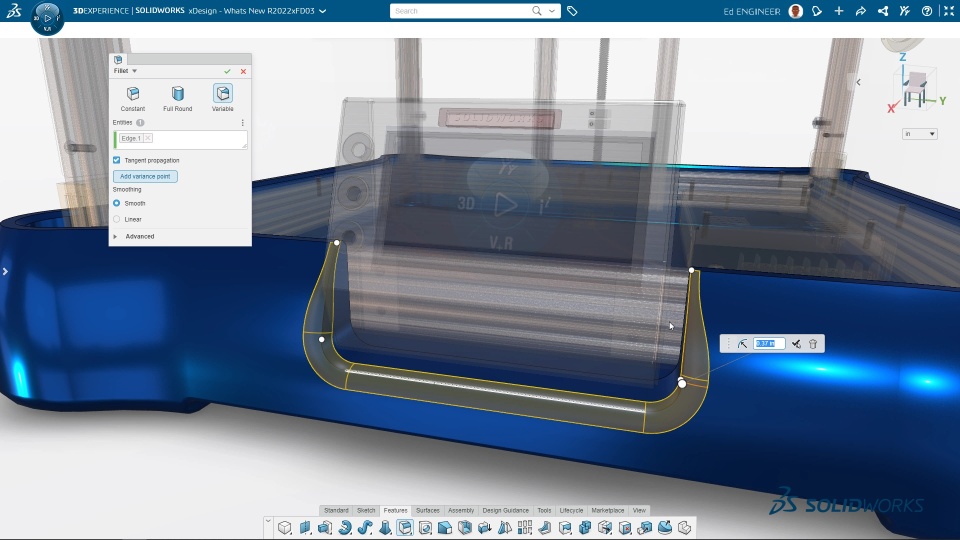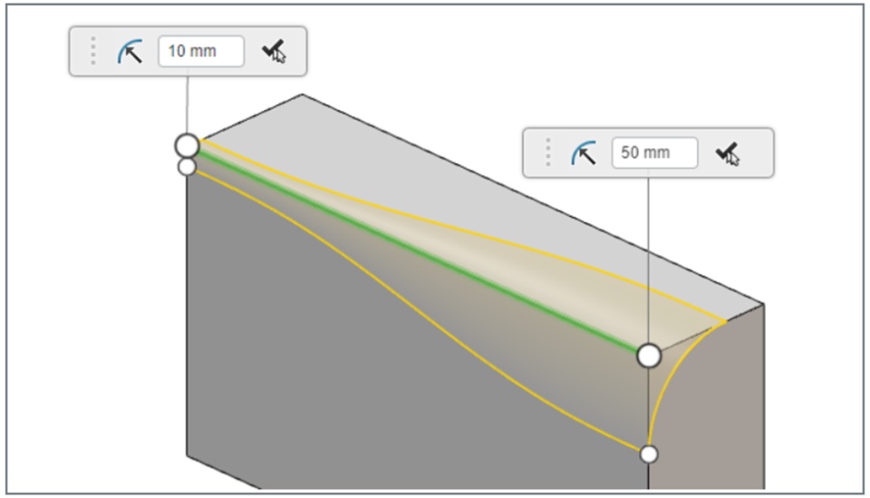 Create Variable Radius Fillets You can now create fillets with a variable radius. You can use variable radius fillets where the geometry cannot support the desired radius, or where varying the curvature of the fillet over the length of an edge results in a better appearance/function.
