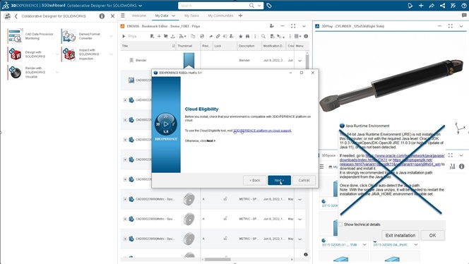 No need to install Java/JRE The installation for SOLIDWORKS Connected downloads a non-Java-based PLM Collaborative Services (PLMCSA) client, which enables the integration between the add-in and the 3DEXPERIENCE platform. This client replaces the Java-based Integration Exchange Framework (IEF) client. You can switch back to the IEF client if you run into any issues.