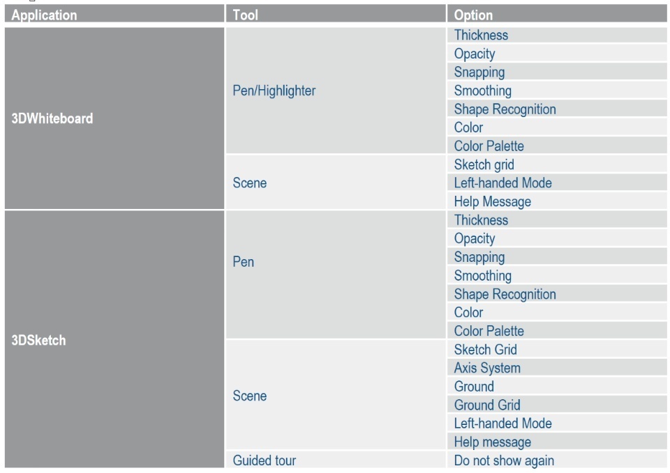 The table below lists the settings that are kept in 3DWhiteboard & 3DSketch.