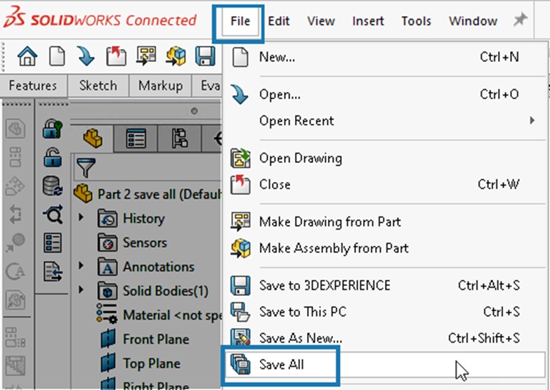 Save All Option The Save All command is available in SOLIDWORKS Connected. When you click Save All, you are prompted to save files to your PC, or to the 3DEXPERIENCE platform. You can save all open or modified files with one command.