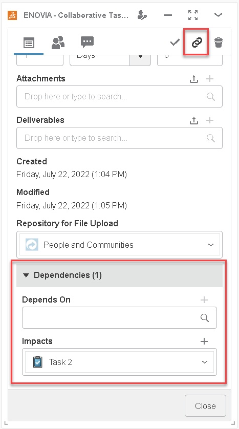 When a task is opened in the Collaborative Tasks widget, the list of properties will now display a new section called Dependencies with two fields called Impacts and Depends On.