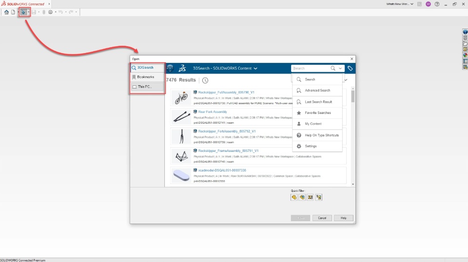 New "Open from 3DEXPERIENCE" Dialog box is available to access your content from 3DSearch, Bookmark Editor or Your PC. So now you can effortlessly open or insert the components from Local computer or the platform.