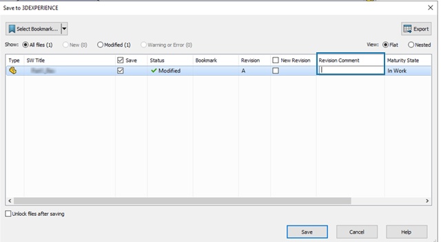 In the Save to 3DEXPERIENCE dialog box, you can add a Revision Comment for individual objects when you click the Save or New Revision checkbox. To enter a comment, click your cursor in the cell that appears in the corresponding row under the Revision Comment column. You can also edit the revision comment from the properties page of the object. In earlier releases, you could only add revision comments for an entire part or assembly. Benefits: You can easily add and find comments related to revisions for individual objects.