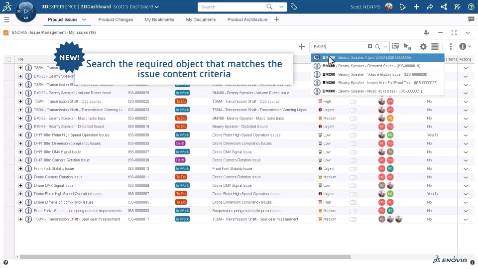Easily find the issues of attention by filtering them according to specific “Affected Items, Resolved Items or Context” in Issue Management app Make informed decisions on documents attached to a route, thanks to the new Approval Status column in Document Management app. Improve collaboration on 3D, by defining and sharing a startup view, in 3D Navigate app. To discover more about these enhancements, please go to this link on the ENOVIA User's Community https://r1132100503382-eu1-3dswym.3dexperience.3ds.com/#community:38/wiki:cNEIE6VGRTulk0bKpkfyjg |