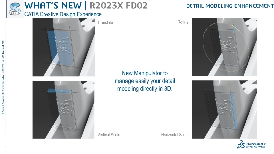 You can now flex features using an improved handle (not overlapping with the Robot handle, and that remains normal to the view). Benefits: It is easier to flex features in the 3D area. For more information, see Translate or Scale Subdivision Objects.