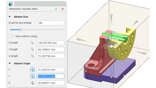 You can display the product cut by a specified volume, showing the internal space. Benefits: You can specify a 3D space inside your product by customizing a volume area and the origin of that volume area to view. The geometry outside that volume area disappears from the view. For more information, see Creating a Volumetric Section View.