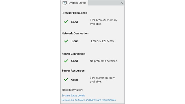 You can view the System Status of the app running in the browser tab widget. Benefits: If experiencing problems in the app, you can view the System Status to see what might be causing the issue. The System Status provides information on the network and server connections, as well as browser and server memory resources. For more information, see Checking the System Status.