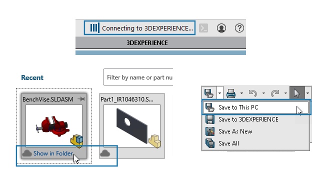 When you connect to the 3DEXPERIENCE platform, a progress bar at the top of the window informs you about the status of the connection. In the Recent Documents list, cloud icons indicate documents that are saved to the platform. The reorganized Save menu shows Save to This PC on top. Benefits: You can easily see the state of your connection to the 3DEXPERIENCE platform and know which documents are saved there.