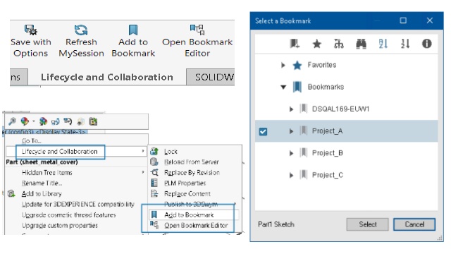 You can use the Add to Bookmark and Open Bookmark Editor commands to quickly open the Bookmark app and add files to Bookmarks. Access these commands from the Lifecycle and Collaboration toolbar, CommandManager tab, or shortcut menu. You can also customize keyboard shortcuts, mouse gestures, and the S-key for these commands. Benefits: You have more flexible ways to add files to your Bookmarks app. |