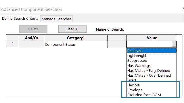 In the Advanced Component Selection dialog box, you can specify Flexible, Envelope, and Excluded from BOM for Component Status. From the Select flyout , you can use Select Flexible Subassembly to select flexible subassemblies in the model. Benefits: From a top-level assembly, you can select the highlighted flexible subassemblies in the Feature Manager design tree. You can easily find assembly envelopes, flexible components, and components that are excluded from the BOM. |