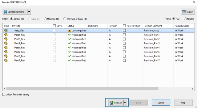 When you right-click a file in MySession and select the Save with Options command, you can click and expand Lock at the bottom right of the Save to 3DEXPERIENCE dialog box to Lock All objects or Lock Selected objects in a part or assembly. It is also easier to find the Lock control. It has moved next to the Save control at the bottom of the dialog box. Benefits: You can lock selected files in a part or assembly. For more information, see Save Dialog Box.