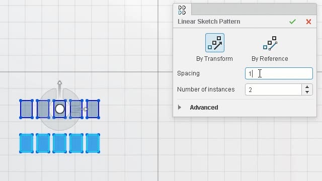 The Linear Sketch Pattern and Circular Sketch Pattern commands now provide the option to skip the creation of a specific instance in a pattern. Benefits: This enhancement provides the flexibility to remove one or more instances of a patterned entity. When you enable the Skip instances option, white dots appear on each instance. Click a dot to skip a particular instance in the pattern. For more information, see Creating Linear Sketch Patterns and Creating Circular Sketch Patterns.
